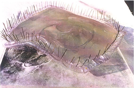 ...what kind of life can be contained in a jellyfish? How many lifes? Lifes pulsing like fertilized egs, always growing in a trembly and unstable way, with a mantra in their only melody. With no limits now, they have just one path - from creation moment to the body definition. A body, a jelly that is a transparent body (jellyfish) - a belly body. I see everything. But to think about life is much more than life itself. There are thorns, roots, broken crystal that, disconverted, become united. - I sew and make bubbles. And it is in the light of these bubbles that a gleam pulses and becomes diffused with no respect, desiring to be revealed. I find the answer in this light......
