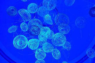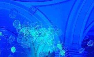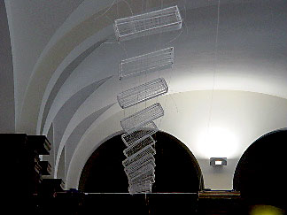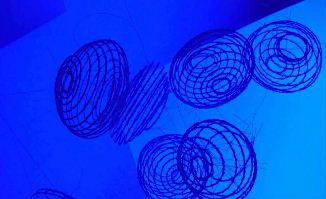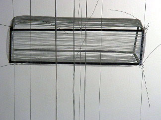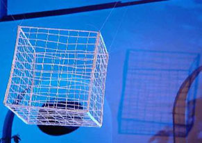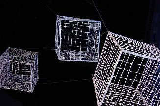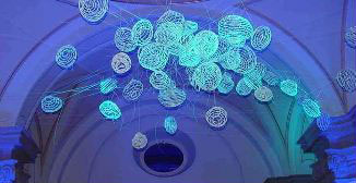 ca. 1000 m weiße Nylonfäden vernetzen Gewölbe, Decken und Hof des ehemaligen Gewerbemuseums (heute Nürnberger Versicherungen und Bildungszentrum der Stadt Nürnberg). Der Blick richtet sich nach oben, in das blaue Labyrinth von Fäden, Kugeln, Quadern und Würfeln, die ins das Netz eingewoben sind.