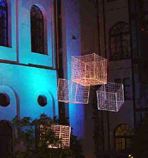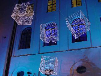 Kugeln im Rund der Kuppeln des Eingangsbereiches an ein Sternenfirmament und die in blaues Licht getauchten Würfel im Innenhof könnten Boxen für Träume sein, die eingefangen, auch ganz schnell wieder verloren gehen.